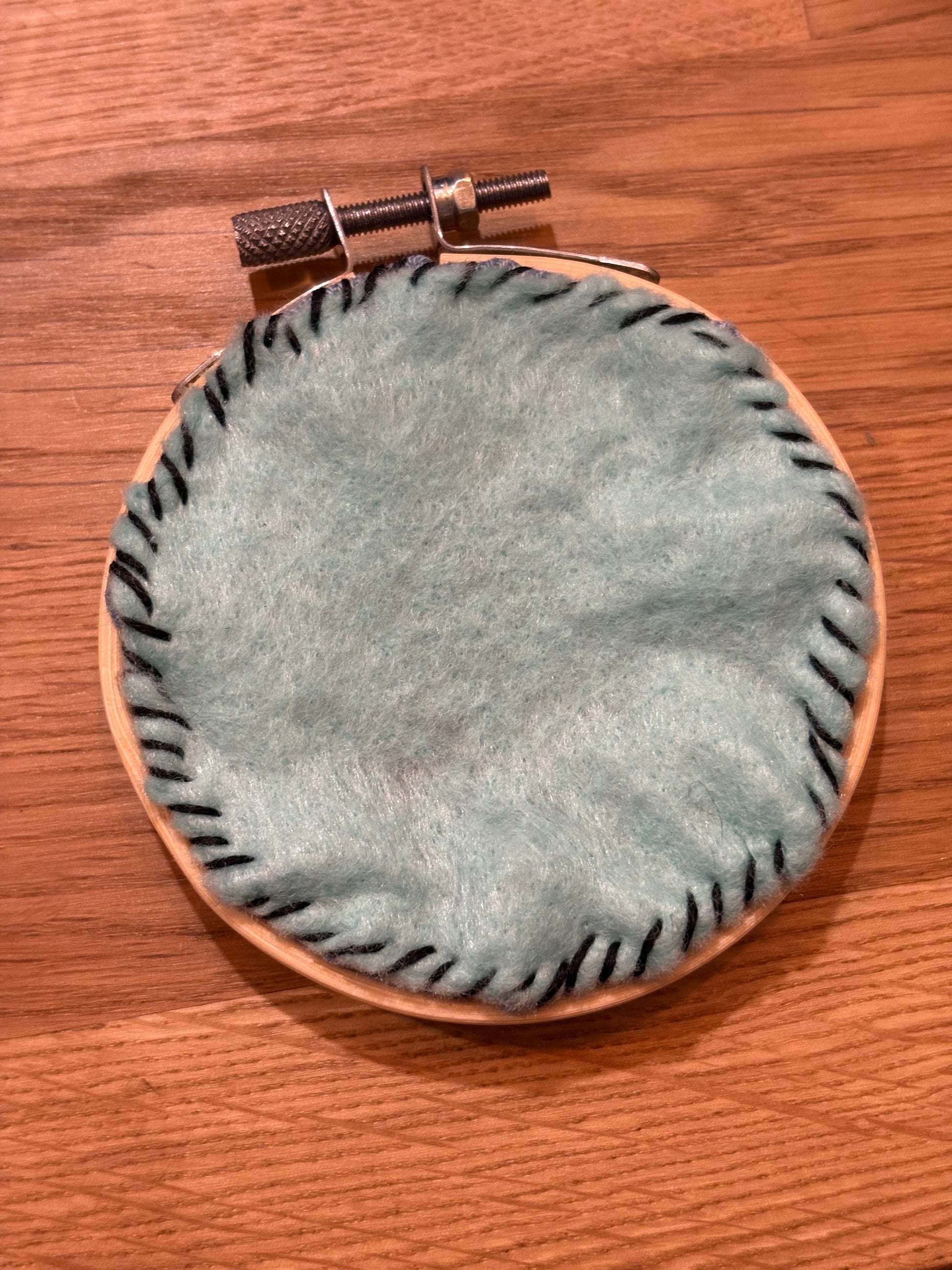 A 3.5 inch circular embroidery hoop featuring raspberries, leaves, and small flowers stitched on reclaimed blue denim fabric. The back of the embroidery hoop has a stitched-on felt backing.